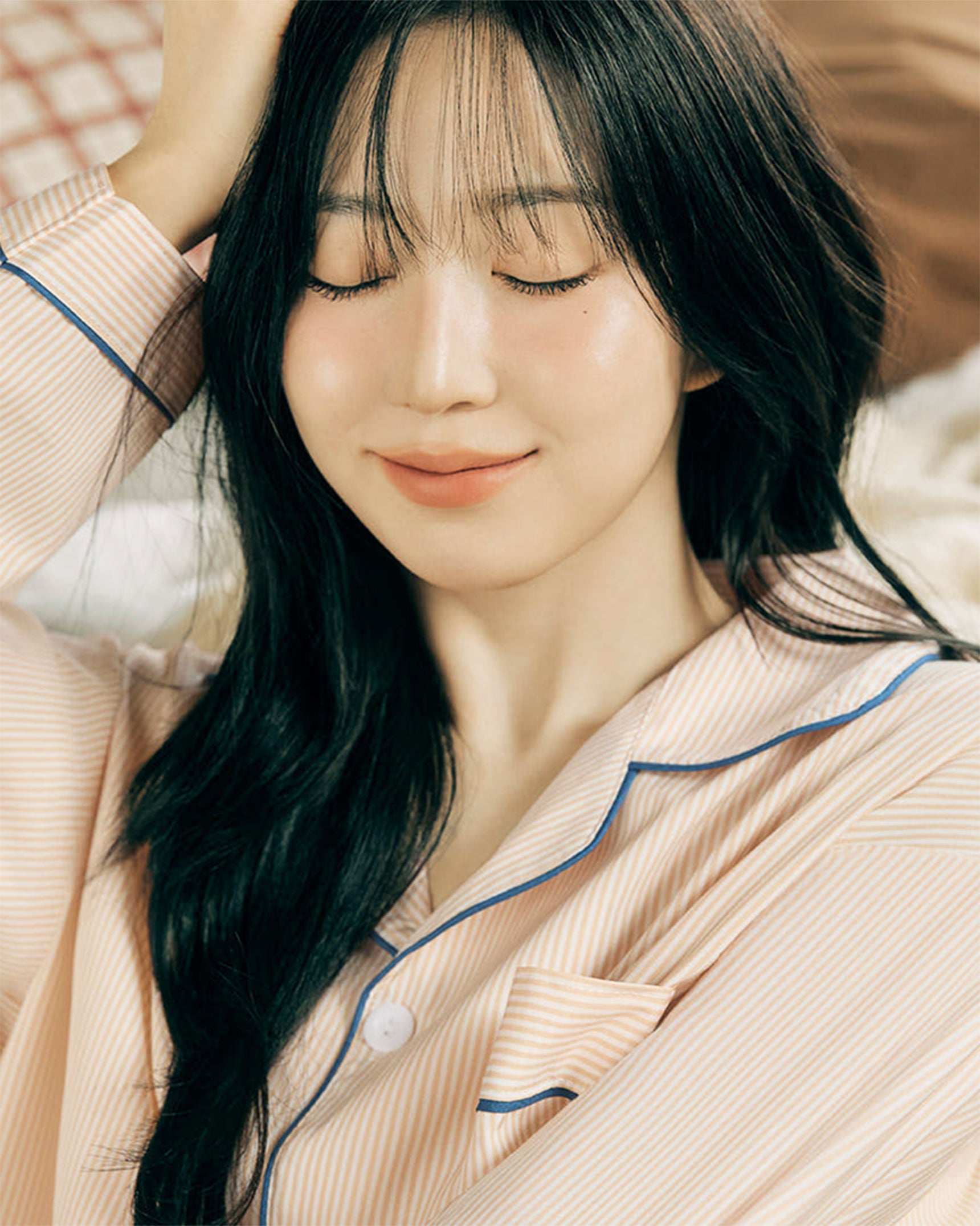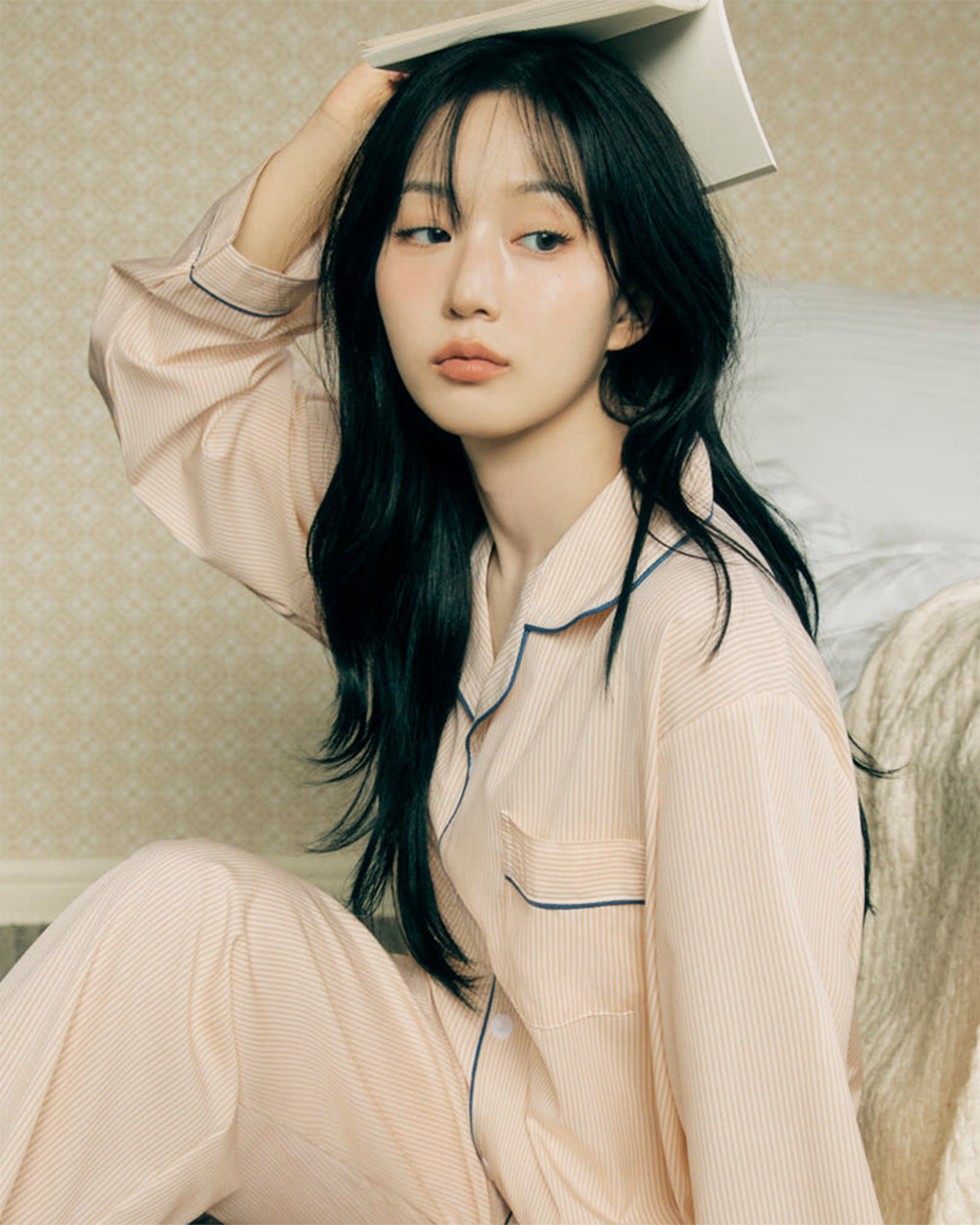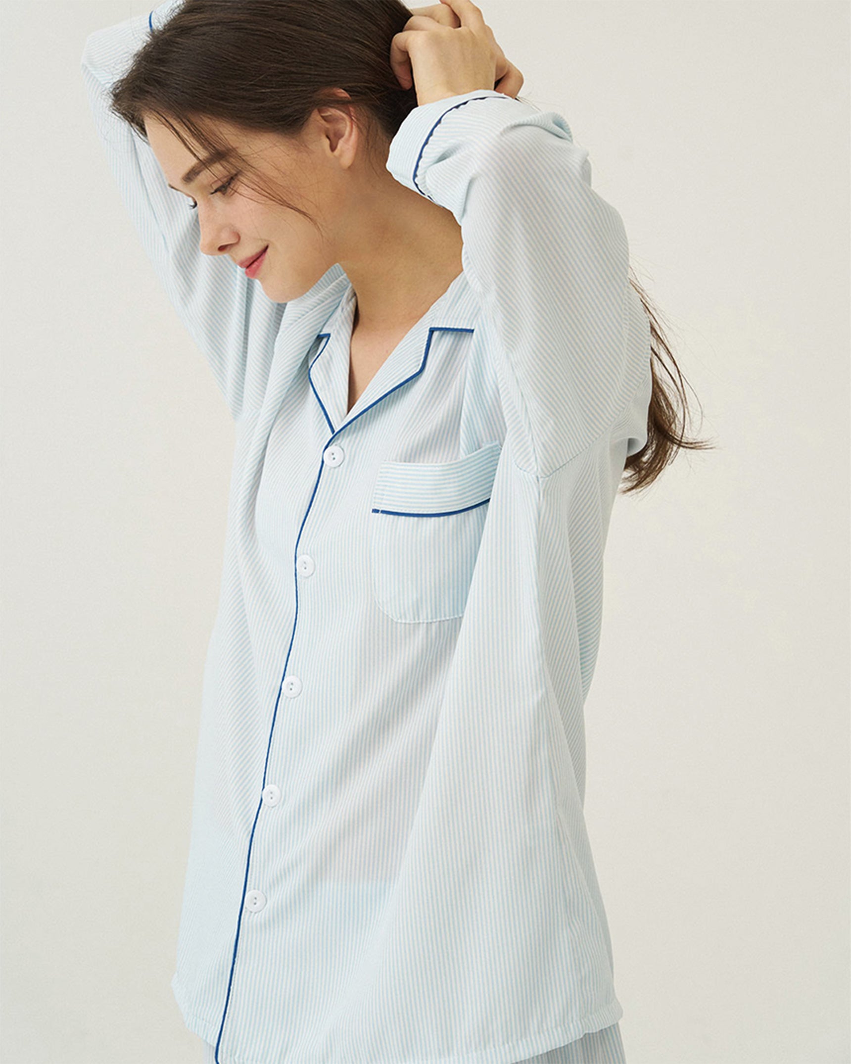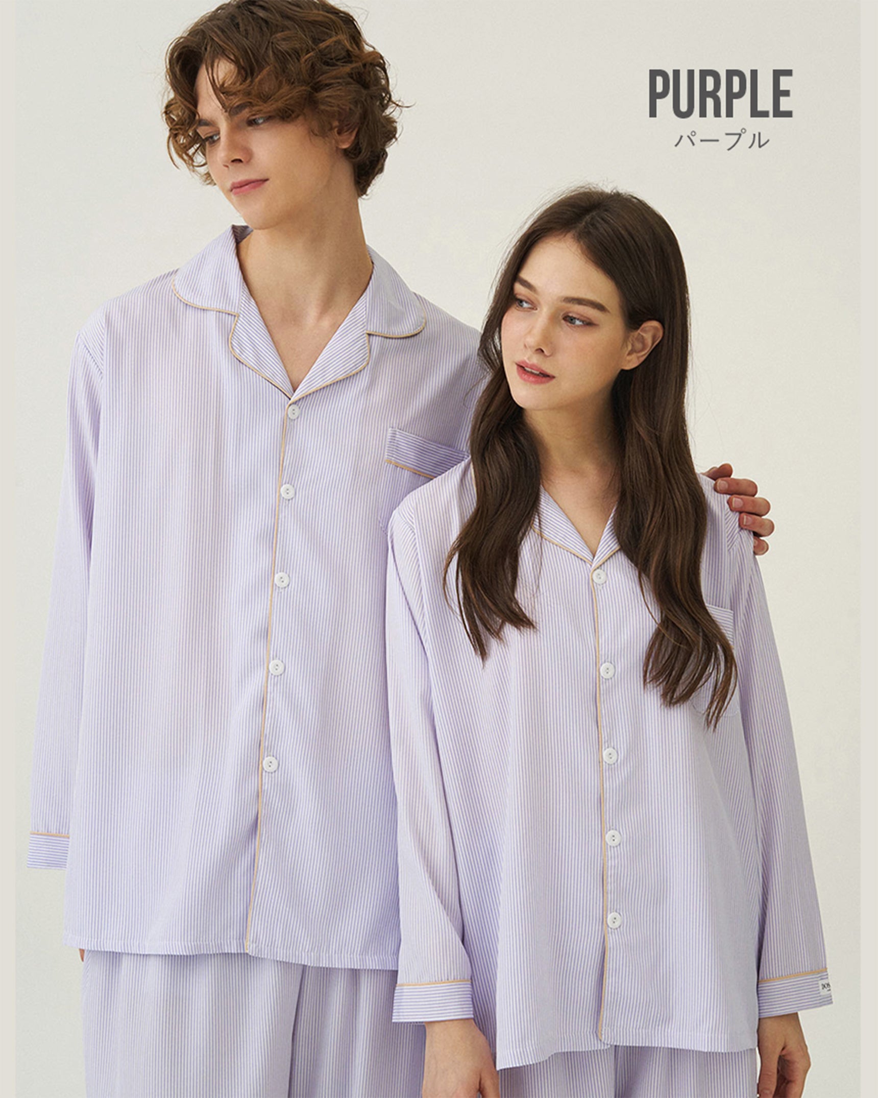 シャツ型パジャマのミニマルなシルエットに、心地よく体を包むルーズフィットを組み合わせたデザイン。