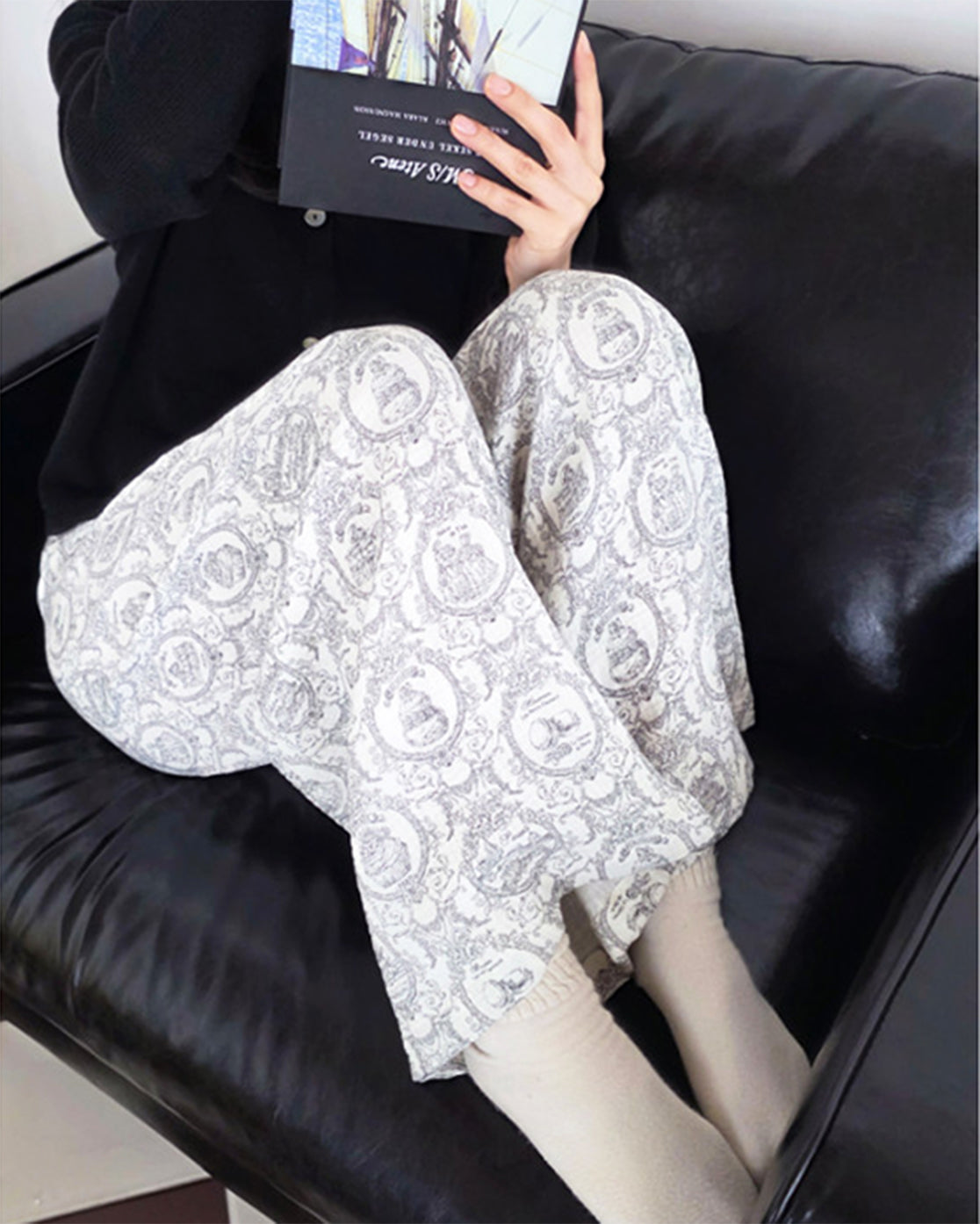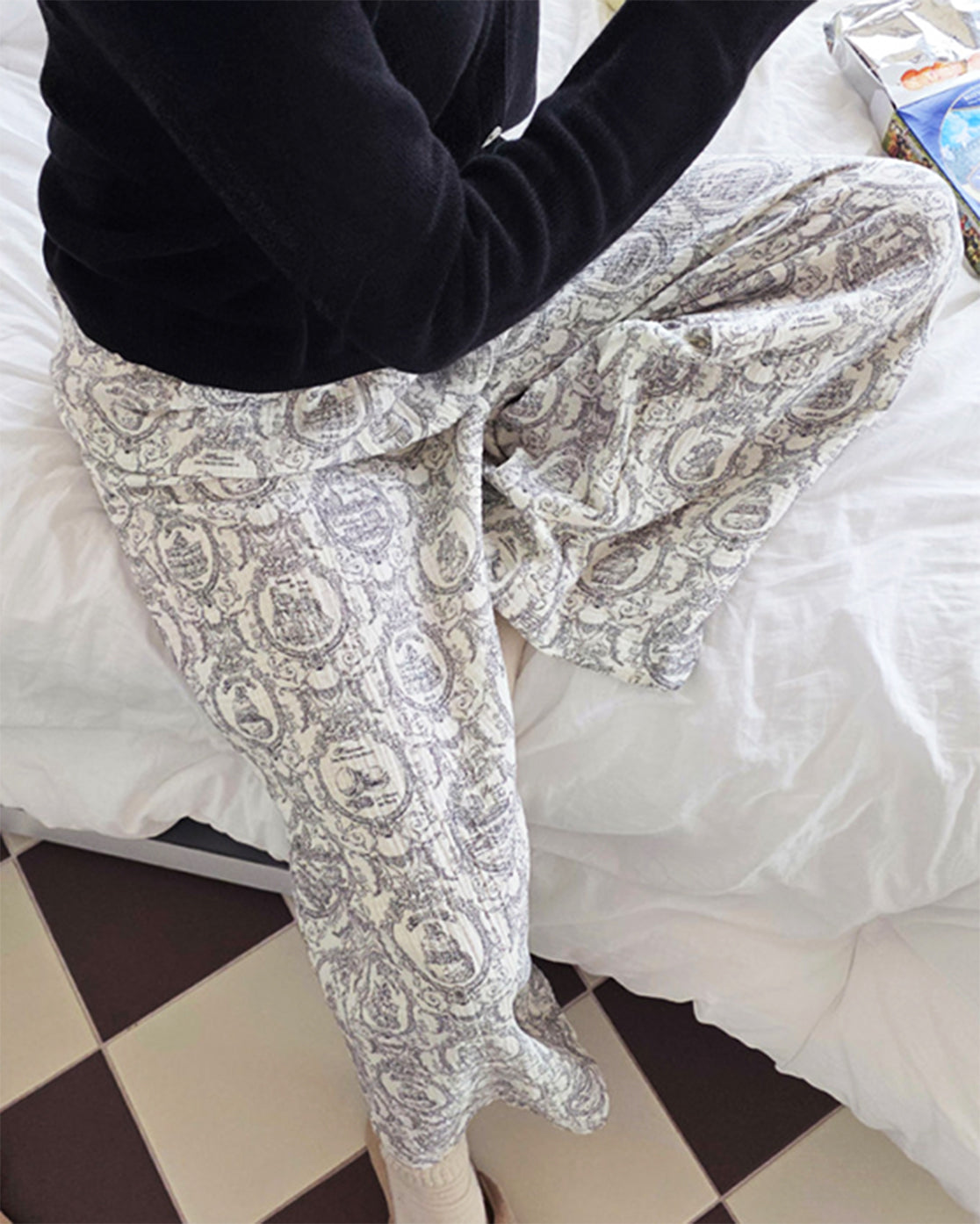 繊細なトワルドジュイ柄が、パジャマとは思えないほどエレガントな印象を与えます。締め付け感のないルーズなワイドフィットで、脚のラインを拾わずリラックス。前回の3重ガーゼシリーズよりもさらに「軽やかさ」を追求したシルエットです。