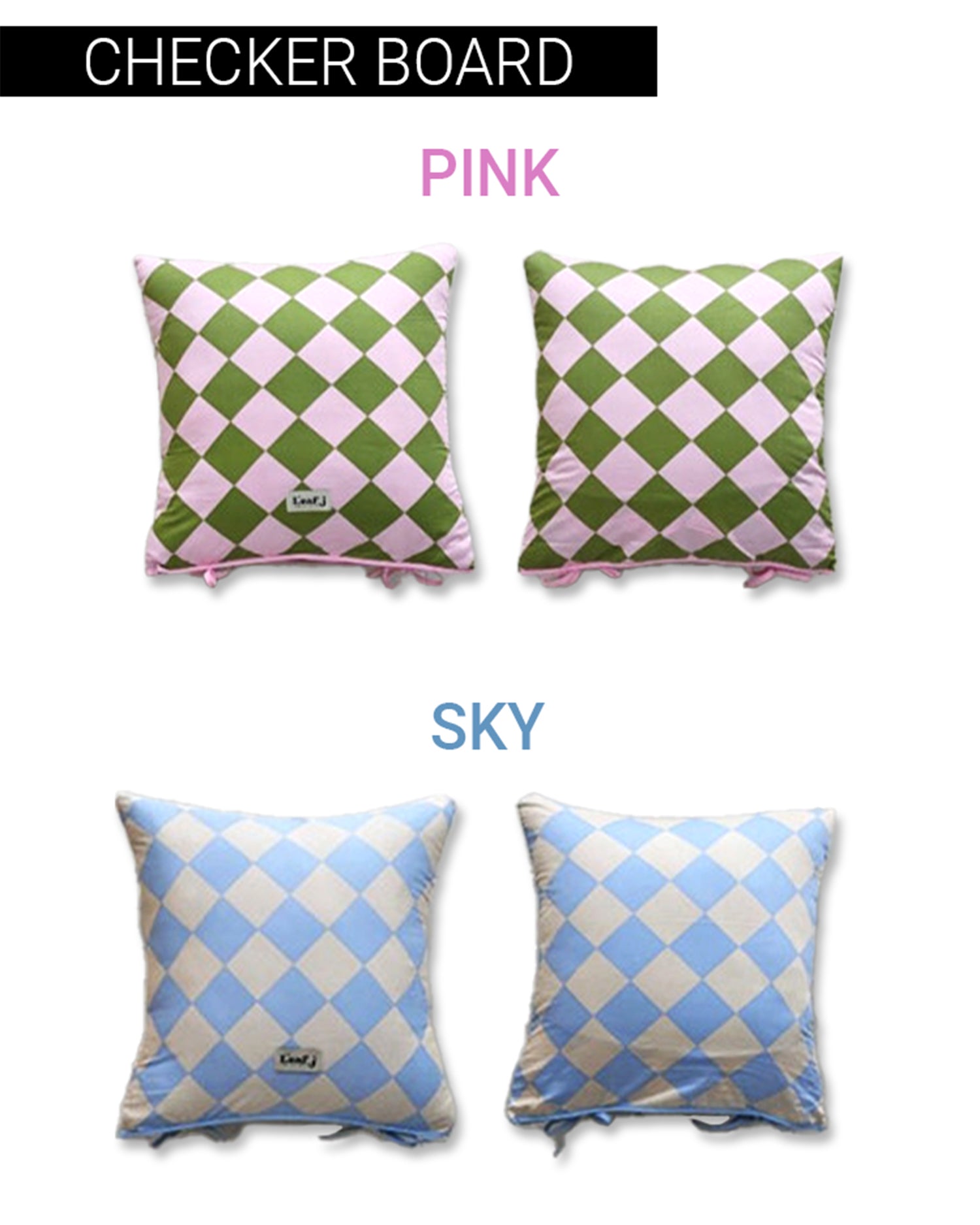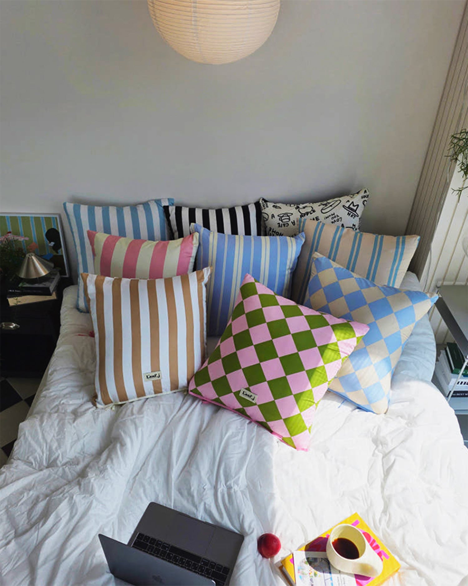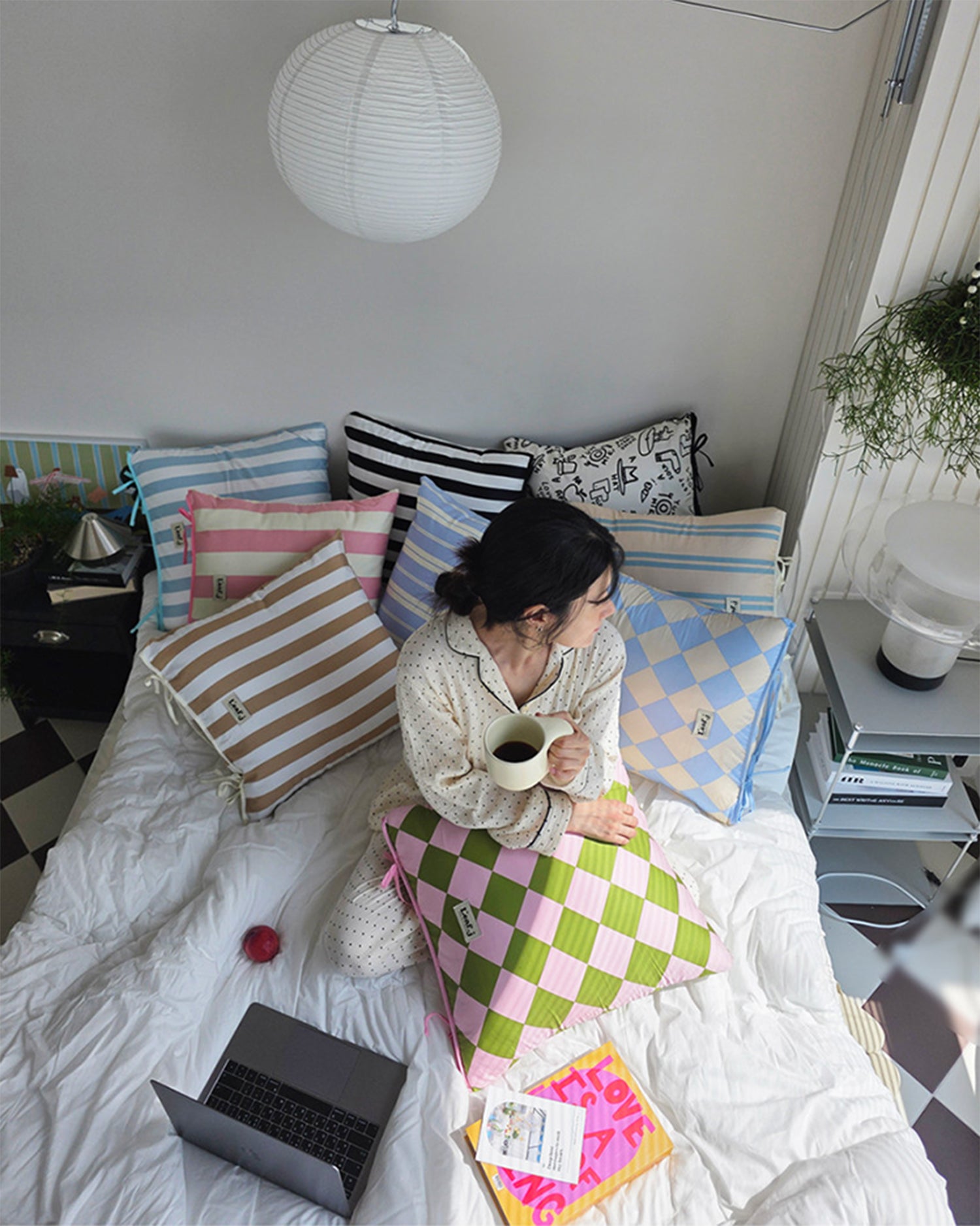 ホームウェアシリーズともリンクする明るい「ストライプ」「チェッカーボード柄」「ダブルライン」「ドロー」の4デザインを展開。四隅のフリルが甘すぎない可愛さを演出し、ベッドやソファに置くだけで韓国インテリアのような洗練された雰囲気に仕上がります。ファスナーが見えにくい仕様で、裏表どちらでも綺麗にお使いいただけます。