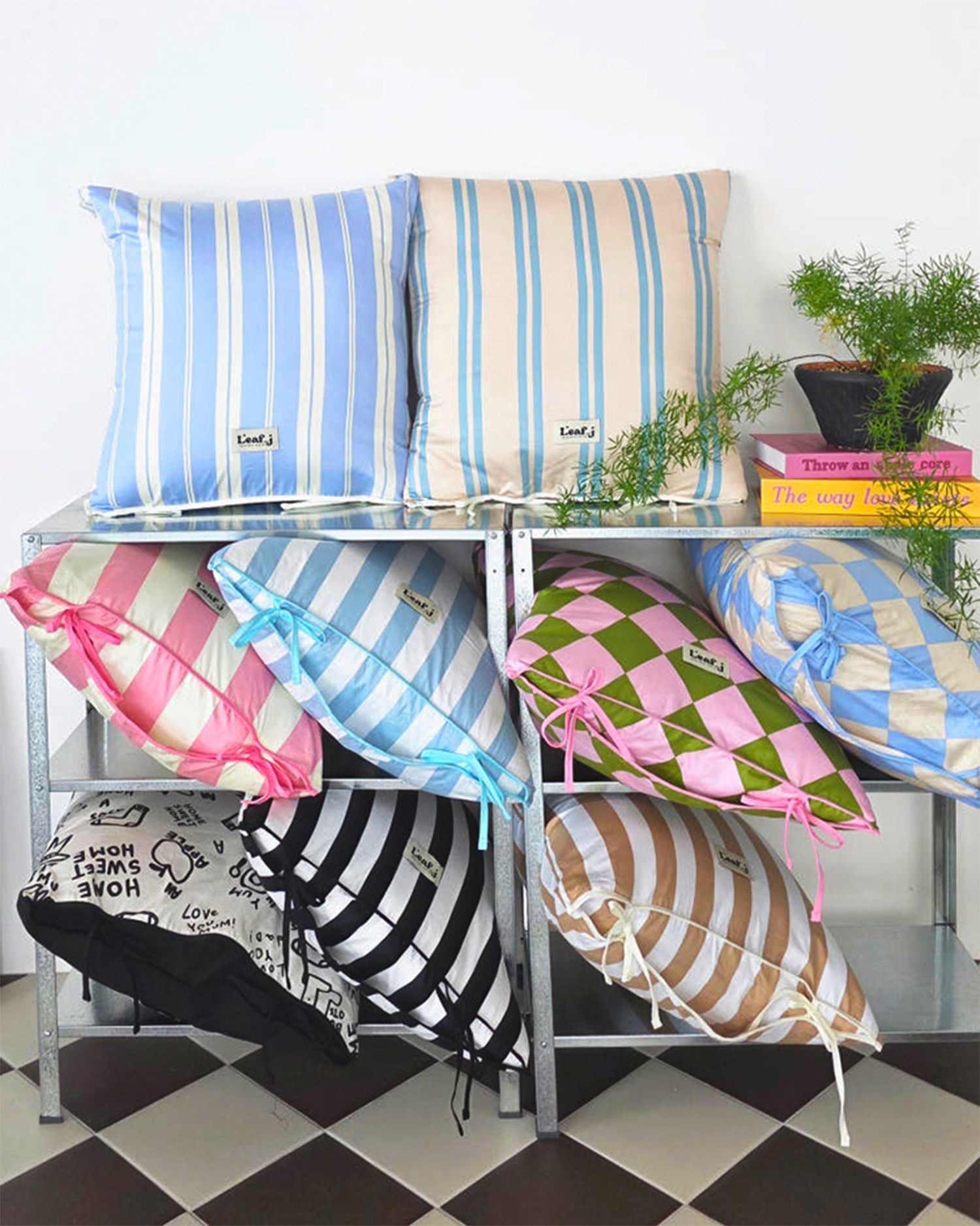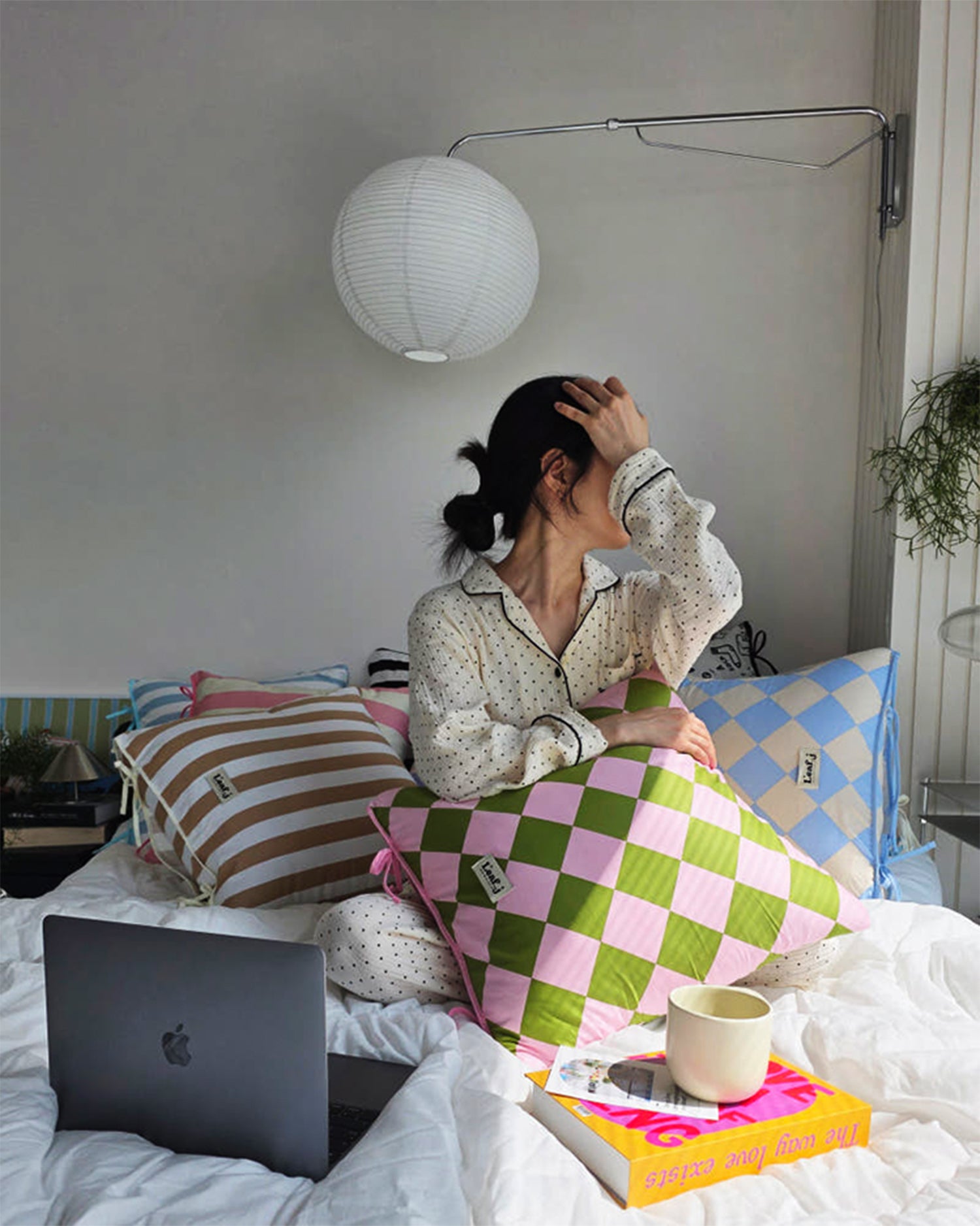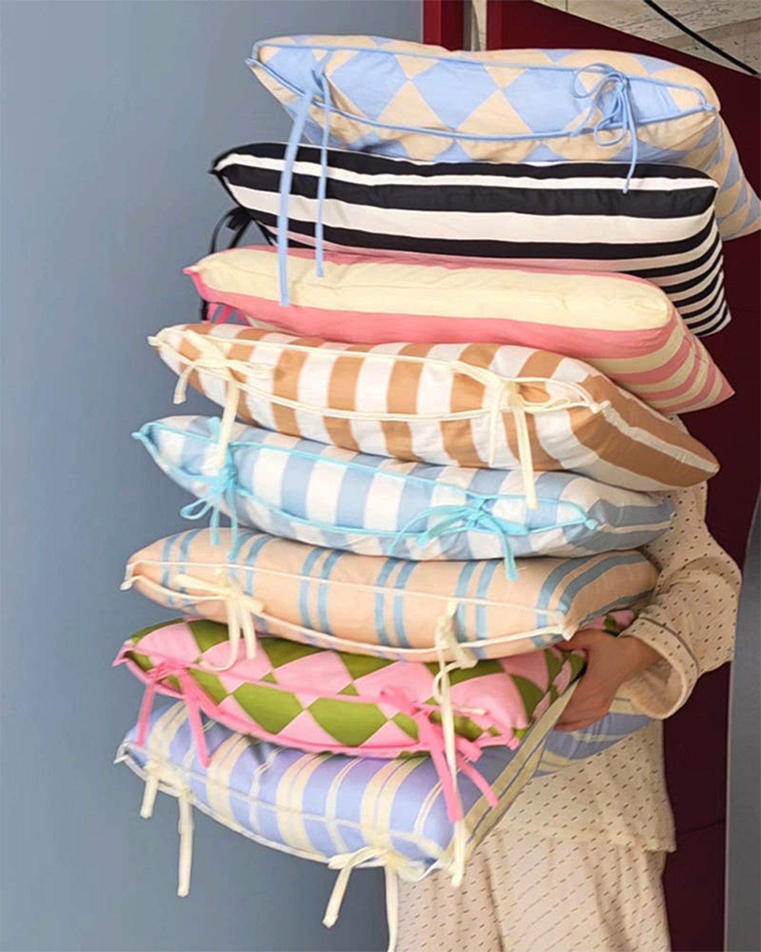 ホームウェアシリーズともリンクする明るい「ストライプ」「チェッカーボード柄」「ダブルライン」「ドロー」の4デザインを展開。四隅のフリルが甘すぎない可愛さを演出し、ベッドやソファに置くだけで韓国インテリアのような洗練された雰囲気に仕上がります。ファスナーが見えにくい仕様で、裏表どちらでも綺麗にお使いいただけます。