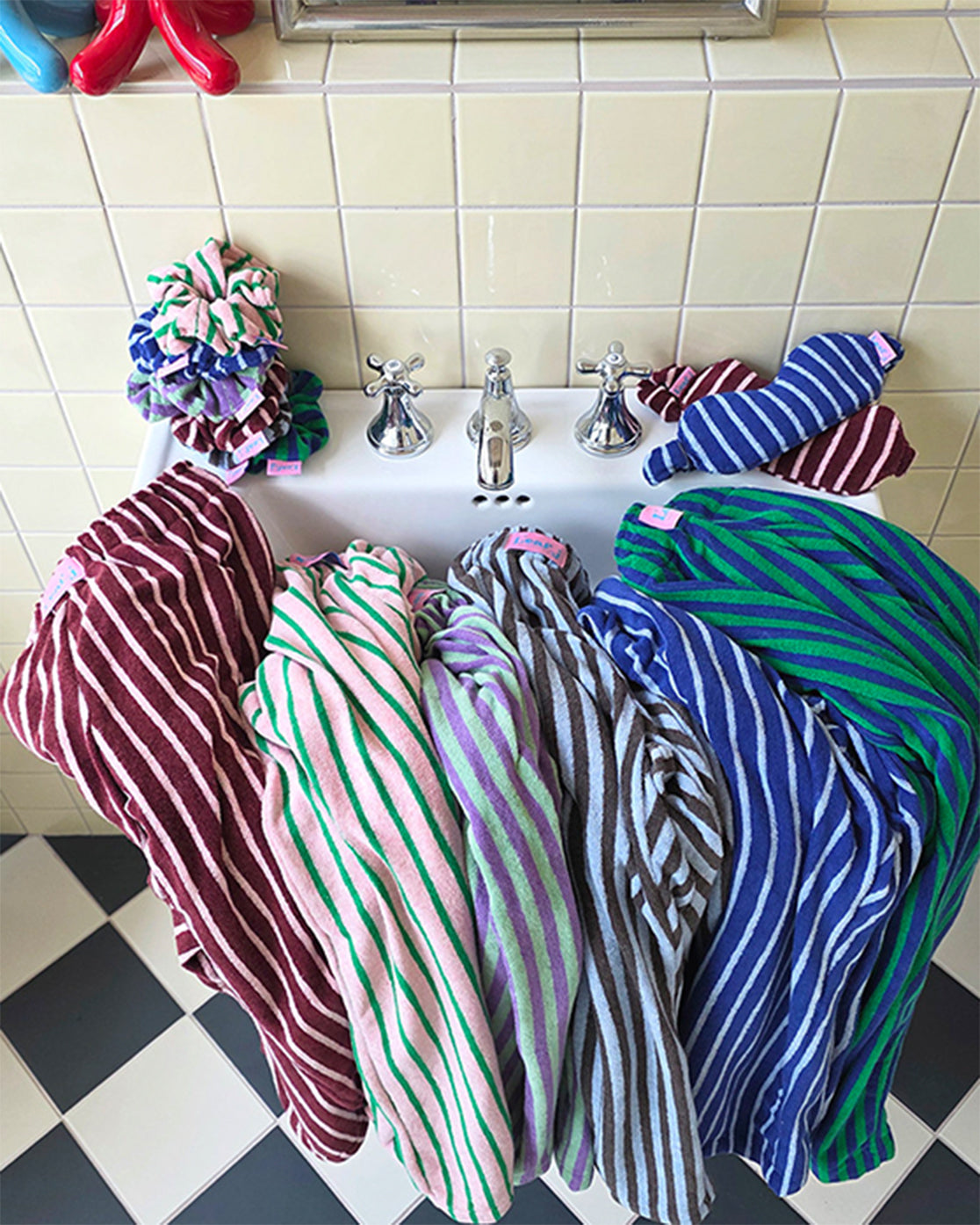 キッチュで愛らしいカラーリングが目を引く、ストライプ柄のテリーシリーズ。 表面はふんわりとしたタオル地(テリー素材)で表情豊かに仕上げつつ、肌に触れる裏面はフラットな綿素材にすることで、これまでにない滑らかな着心地を実現しました。