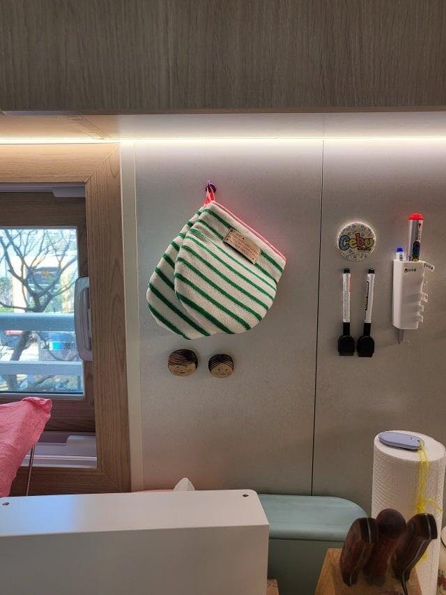 手首までしっかりと覆うロング丈で、オーブンからの取り出しや、大きな蒸し器を扱う際も安心。親指が分かれたミトン型は、握りやすさを重視した設計です。テリー生地なので、調理中に濡れた手をサッと拭くことができるのも、このシリーズならではの魅力。