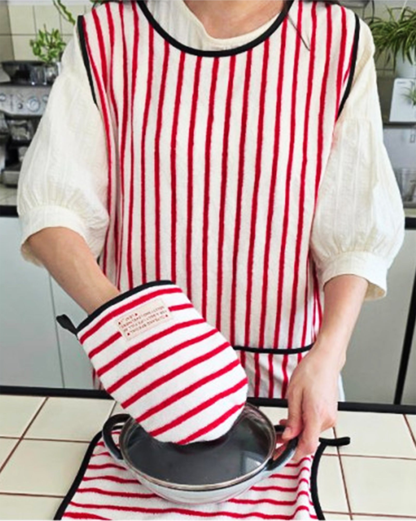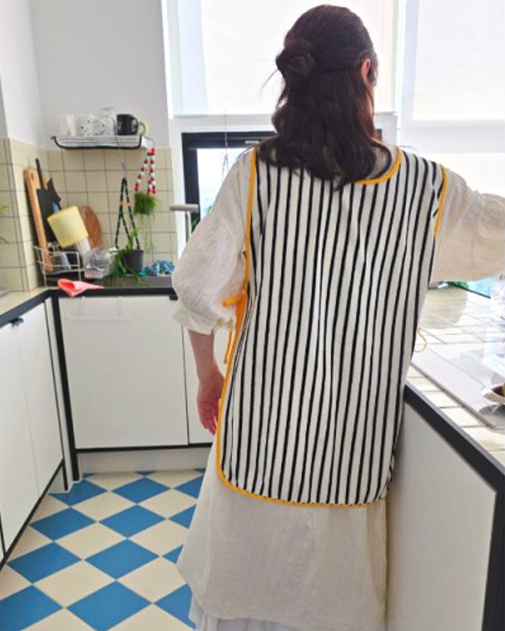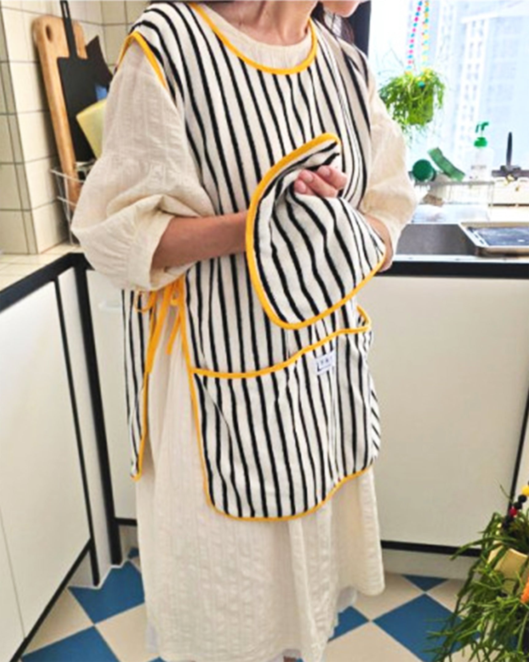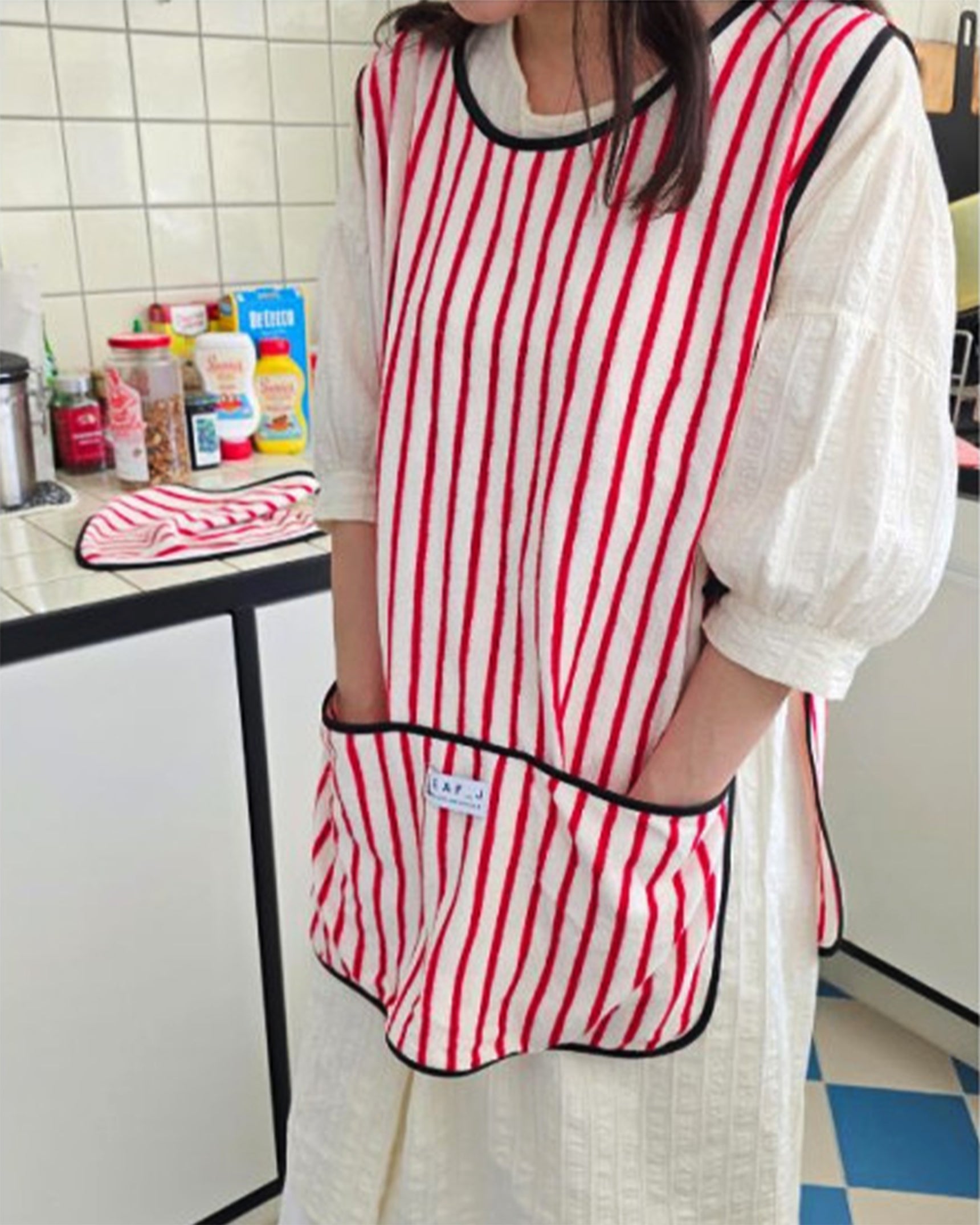 長すぎない絶妙なミニ丈(ハーフ丈)が動きやすく、どんな服装の上からもサッと巻ける優秀デザイン。LEAF_Jの他アイテムと同じニュアンスカラーのストライプ柄なので、お家の中でのコーディネートも統一感が出てぐんとおしゃれに見えます。便利なフロントポケット付きで、スマホや小物の持ち運びにも困りません。