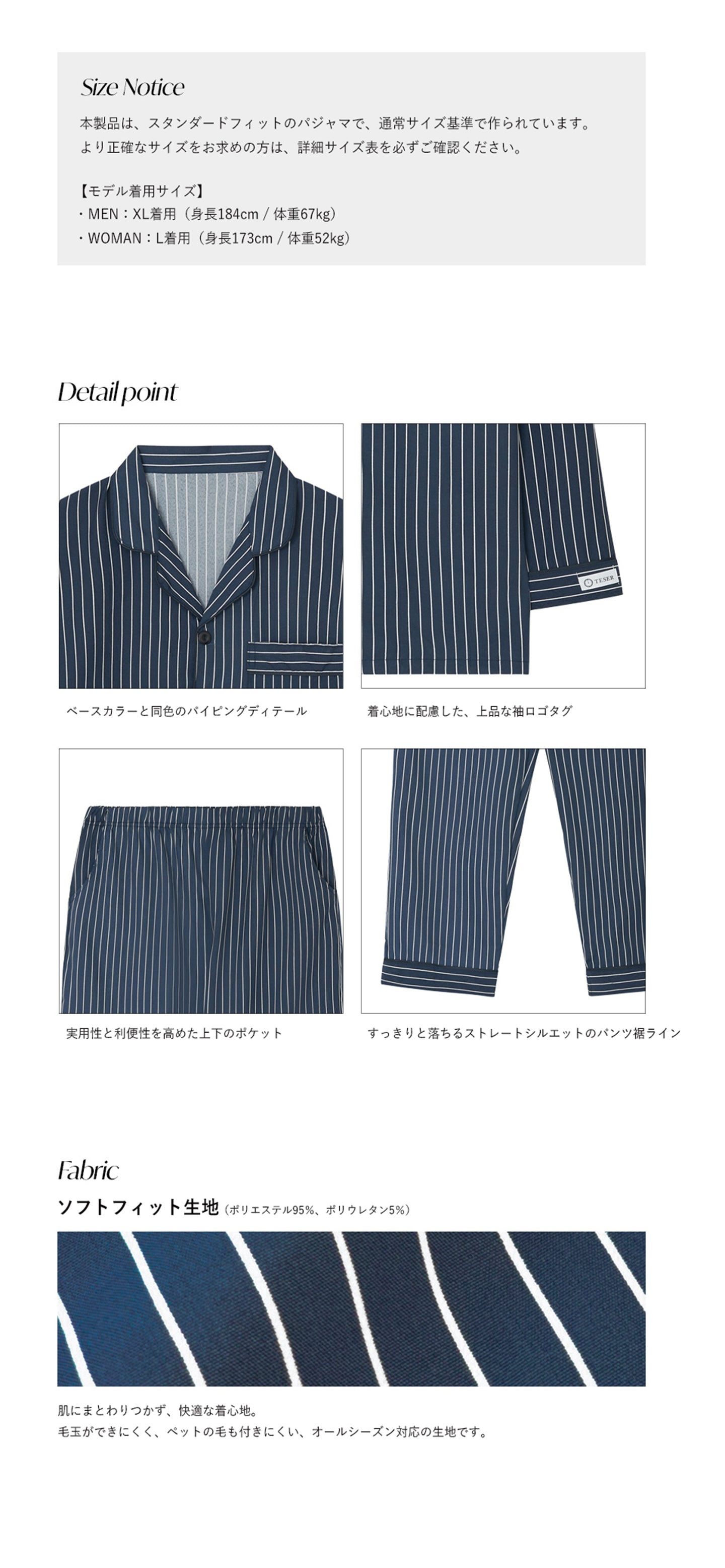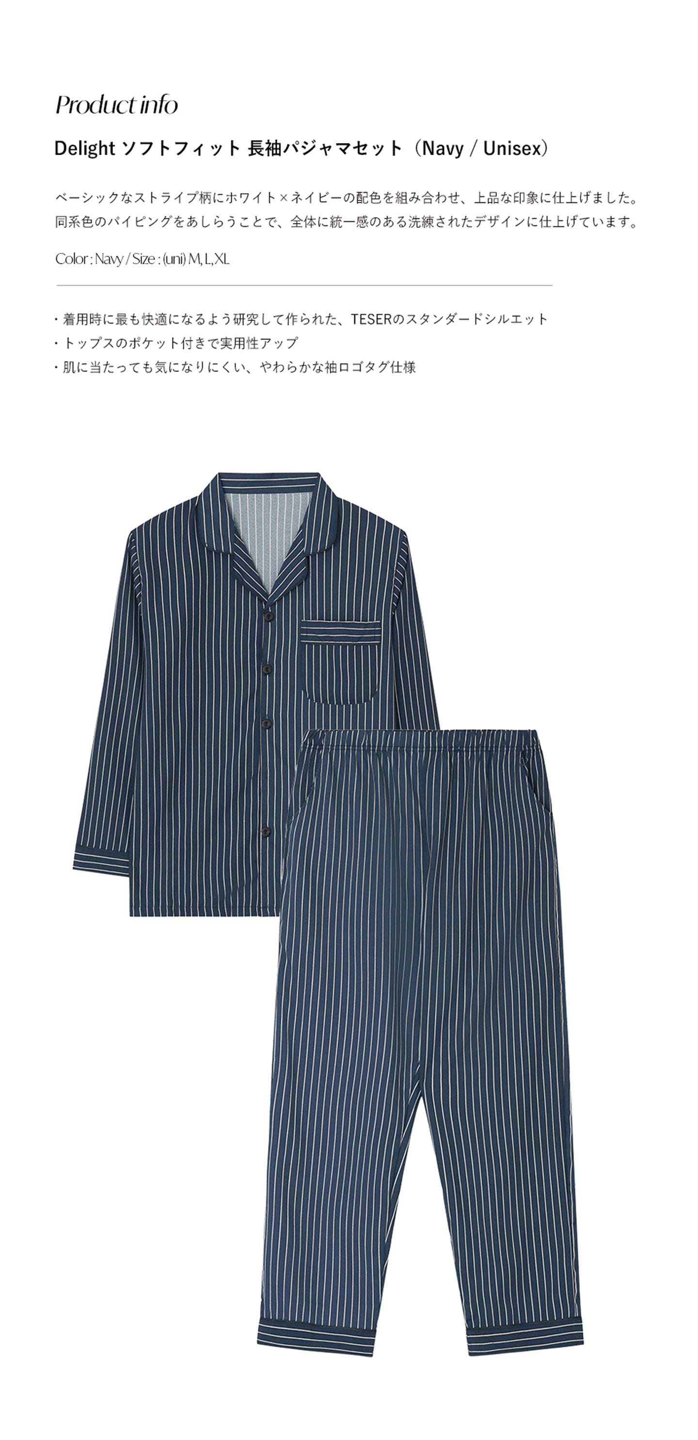 TESER Delight ソフトフィット ストライプ 長袖パジャマセット(Navy / Unisex)