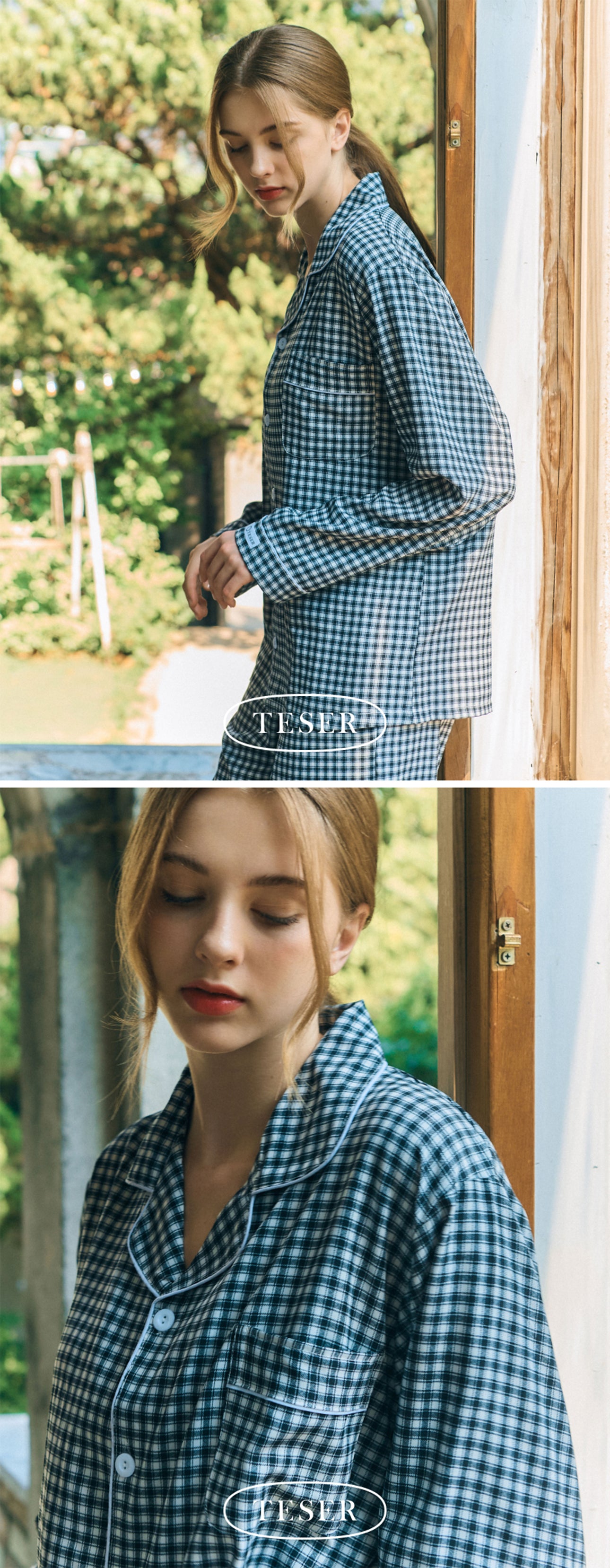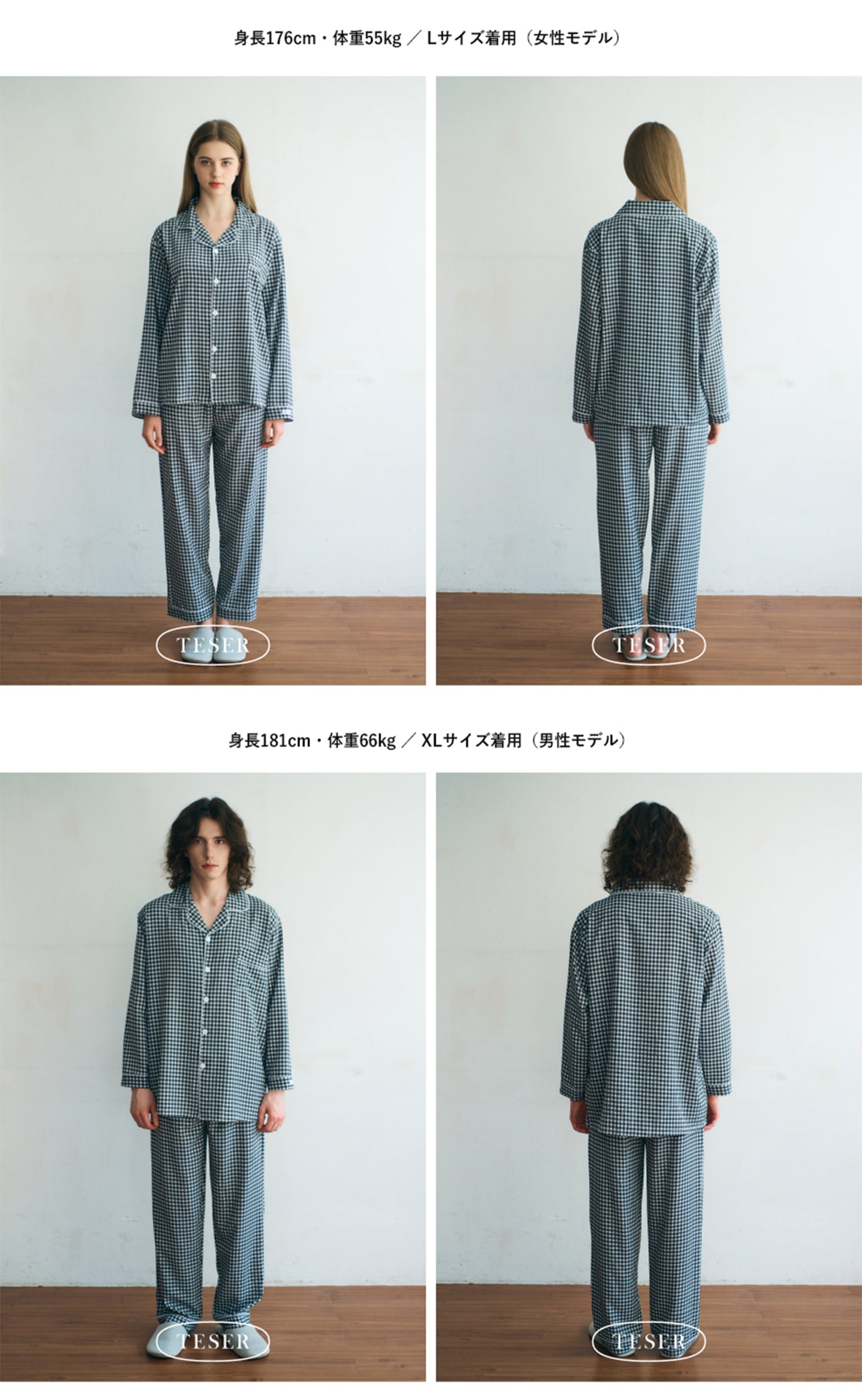 TESERオリジナルのチェックパターンを使用したユニセックスパジャマセット。