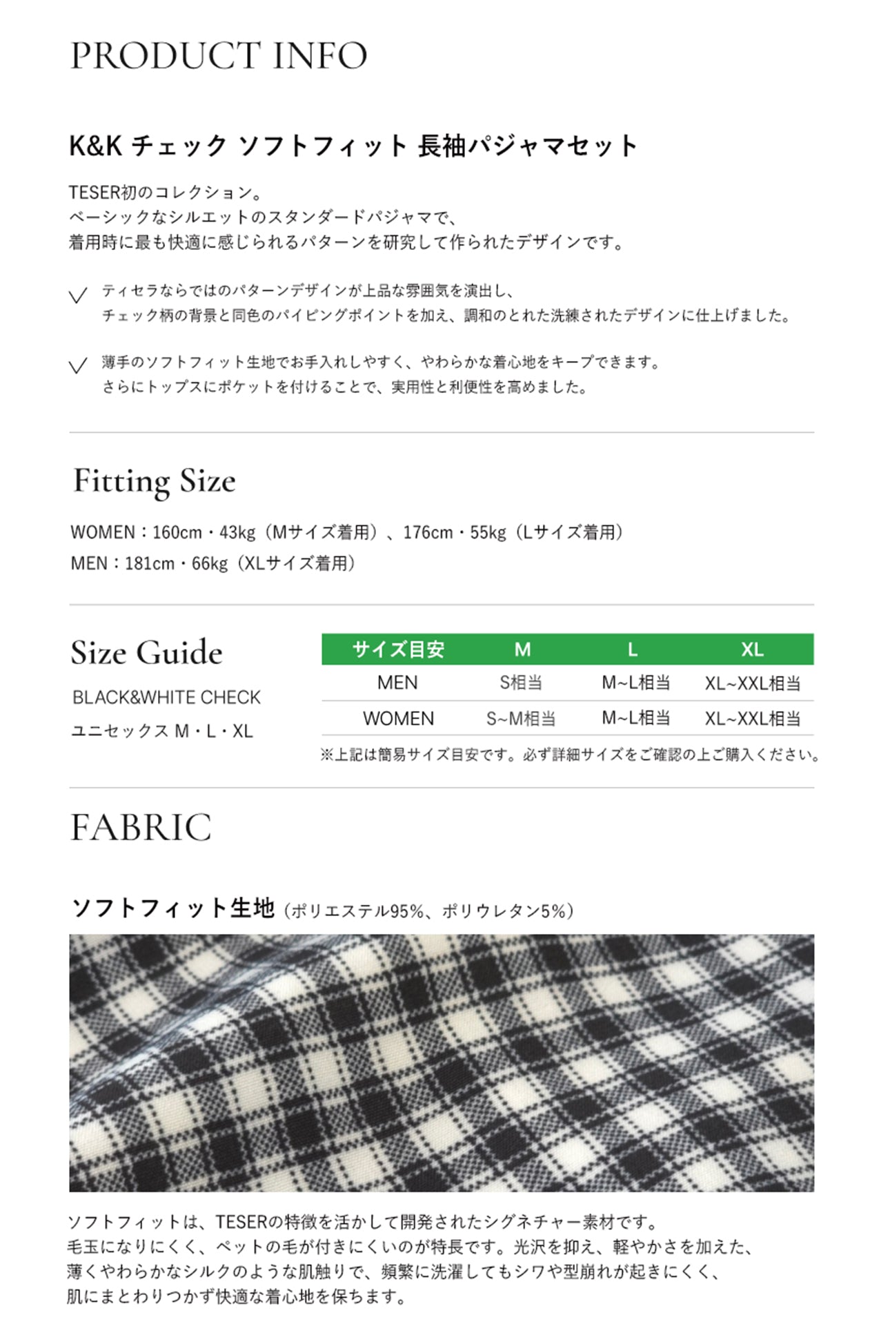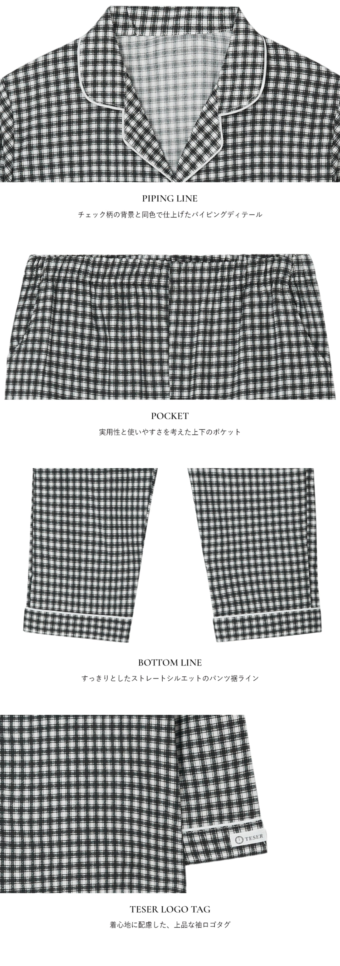 TESER K&K チェック ソフトフィット 長袖パジャマセット(Black & White / Unisex)