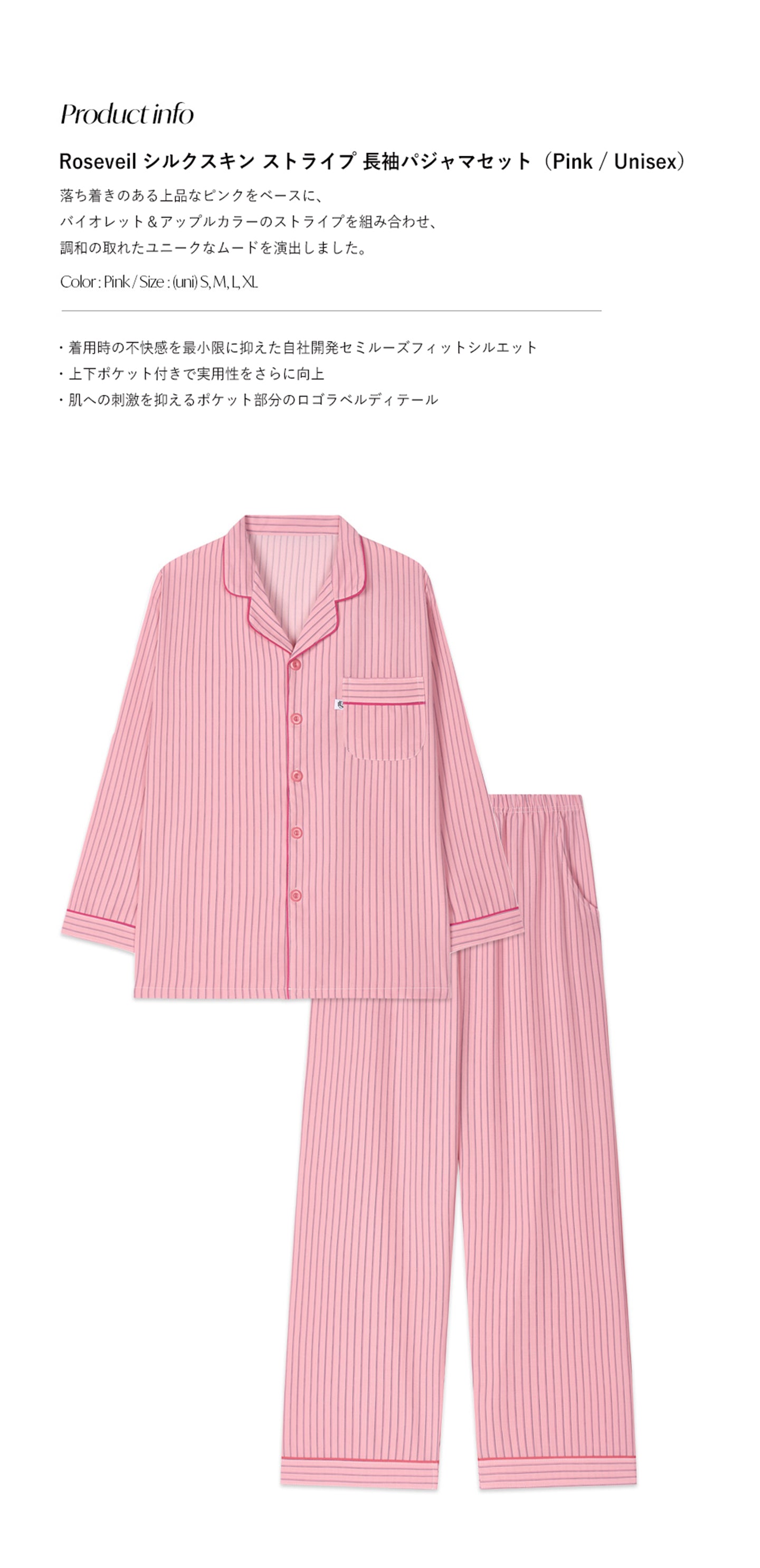 TESER Roseveil シルクスキン ストライプ 長袖パジャマセット(Pink / Unisex)